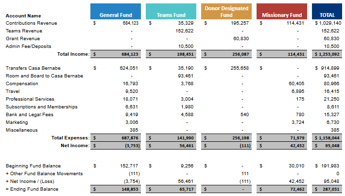Below is a breakdown of Friends of Casa Bernabé’s primary funds and financial statement line items to help you understand how your support directly impacts the mission of Casa Bernabé.